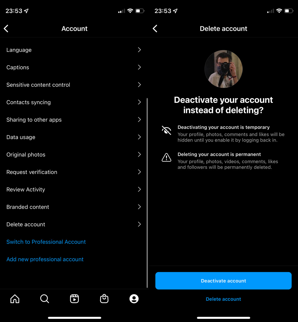 If you have it, tapping on it will bring up a menu asking if you want to delete or deactivate your account — you can read more about those other options in the “Temporarily suspending your Instagram account” section of this how-to. Pressing the Delete account button will bring up a message saying that you can stop the deletion process by a certain date if you log back in.