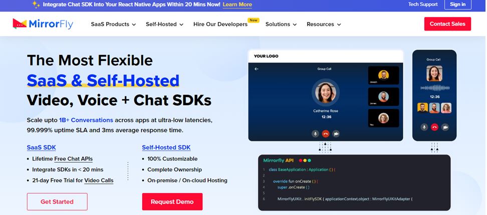 Also, just like to ZEGOCLOUD, MirrorFly allows you to add in-all functionalities that can run on various mobile device models, including Android and iPhone to your application without any harm. And it has an excellent security system built with end-to-end encryption, ensuring users enjoy top-notch protection.